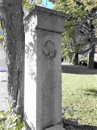 Denkmal für die Gefallenen des Ersten Weltkriegs: Viereckige Stele mit Deckstein und Stahlhelm-Relief im oberen Bereich auf dem Kirchhof.