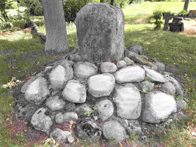 Denkmal für die Gefallenen des Ersten Weltkriegs am Rande des Friedhofs: Feldsteinhaufen mit eingravierten Namen der Gefallenen und aufgesetztem Findling mit der Widmung.