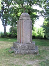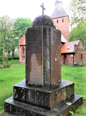 Denkmal für die Gefallenen des Ersten Weltkriegs neben der Kirche: Fünfseitiges Denkmal, vier Seiten mit Ortsüberschrift und den jeweiligen Namen der Gefallenen, eine Seite mit Widmung, mit einer Masse zugeschmiert und die Zahl „1971“ oben angebracht.