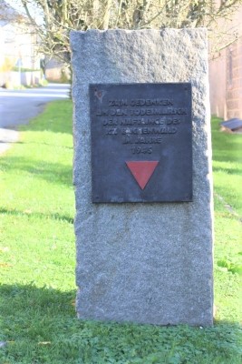 An der Dorfstraße gegenüber der Auffahrt zur Kirche an einem Granitblock die regionaltypische schwarze Gedenktafel aus Metall mit dem roten Dreieck als Symbol der politischen Häftlinge.