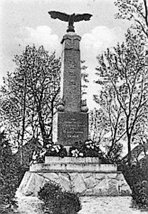 Denkmal für die Gefallenen des Ersten Weltkriegs: Abgeschrägter Sockel aus Natursteinen, darauf eine abgestufte Stele mit EK-Zeichen im oberen Bereich und krönendem Adler. Das Denkmal wurde abgerissen, aber Teile davon lagen bis in die 2000er Jahre im Dorf.