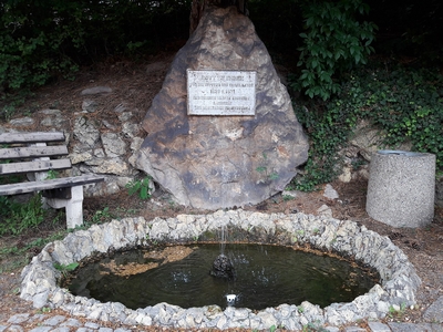 Vor dem Stein ein kleiner Springbrunnen und daneben ein Bank.
