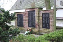 Dreiteilige Mauer, Mittelstück etwas größer als die Außenteile. Darauf ein Eisernes Kreuz mit Jahreszahlen. In den drei Teilstücken jeweils eine Gedenktafel mit Namen aus poliertem Granit.