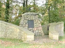 Dem Friedhof gegenüber stumpfer Obelisk aus Natursteinen, darauf liegender flacher Findling mit aufgesetztem Eisernen Kreuz.