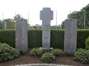 Gedenkstätte für die Gefallenen beider Weltkriege auf dem Friedhof: Dreiteiliges Denkmal, mittig mit Inschrift, die beiden daneben mit den Namen.
