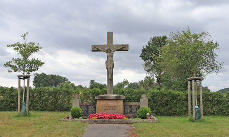 In die Seitenwände ist je eine schwarze Steintafel mit den Namen und Lebensdaten der Gefallenen und Vermissten beider Weltkriege eingelassen.