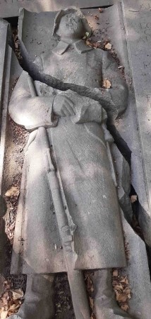 Denkmal für die Gefallenen des Ersten Weltkriegs aus Steinplatten: Dreigeteiltes Unterteil mit Soldatenrelief in der Mitte, seitlichen Namenssteinen und aufgesetztem geschwungenem Oberteil mit EK-Zeichen und Widmung. Das Denkmal wurde nach 1945 umgestürzt und liegt noch heute flach auf dem Boden neben der verfallenen Kirche.