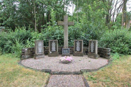 Ein Weg führt zu einem runden Platz, vor einer niedrigen Mauer 2 + 2 Stelen und 1 lateinisches Kreuz, alles aus Stein.