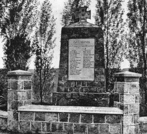Ehemaliges Denkmal für die Gefallenen des Ersten Weltkriegs: Aus Natursteinen gemauerte Stele mit eingelassener Widmungs- und Namenstafel und krönendem EK-Zeichen. Das Denkmal wurde nach 1945 komplett abgerissen.