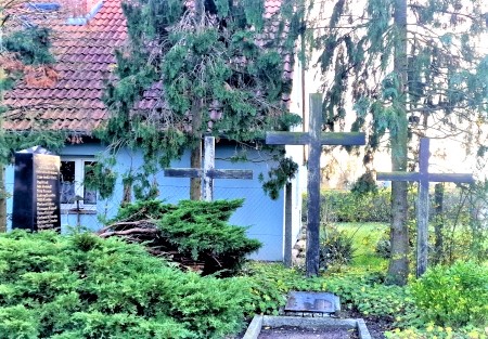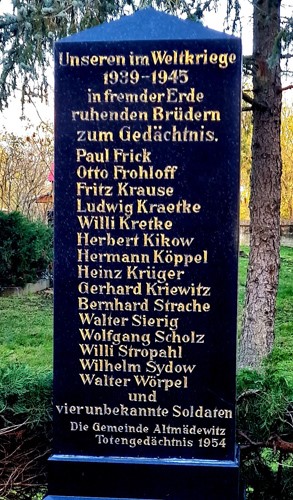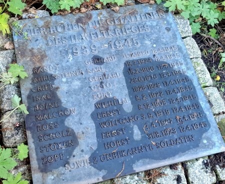 Schwarze Denkmal-Stele mit goldener Schrift auf dem Friedhof, daneben die Kriegsgräber der hier bestatteten Soldaten.