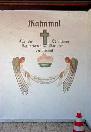 An der Aussegnungshalle im Friedhof ein Mahnmal in Form eines Wandgemäldes, bestehend aus einer Gedenkinschrift,