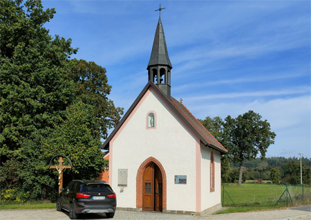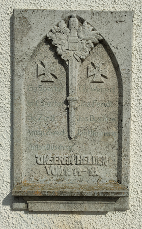 Stark verwitterte Steintafel an der Kapelle für den 1. Weltkrieg. Nur die Namen sind noch lesbar.