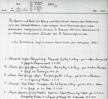 Für Kaiser und Reich, für König und Vaterland, starben den Heldentod auf Schlachtfeldern oder erlagen ihren Verwundungen in den Lazaretten, nachgenannte, bis zum 31. Dezember 1915 (bis zum 31. Dezember 1918) beim Standesamt I in Altona beurkundete Glieder der St. Johannisgemeinde: