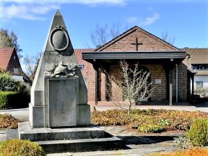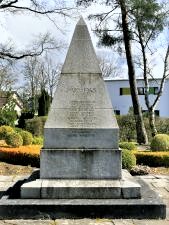 Das Ehrenmal in Form einer Pyramide steht auf dem alten Friedhof. Auf der Vorderseite sind die Namen der Opfer des Ersten Weltkrieges angebracht,