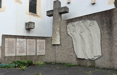 Vier Steintafeln mit Namen und Sterbejahr in eine Wand eingebaut. An einer in einem rechten Winkel angebauten Wand das Relief dreier Personen, die mit ausgestreckten Armen Richtung eines großen Kreuzes blicken. Über den Namenstafeln, aus der Kirchenmauer herausragend, ein quadratischer Steinblock mit Tatzenkreuz.