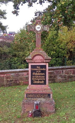 In einer Rasenfläche vor der Aussegnungshalle ein Denkmal der katholischen Kirchengemeinde für die Gefallenen.