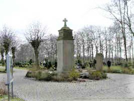 Rondell im Eingangsbereich des neuen Friedhofs: Säule mit Namen der Gefallenen des Ersten Weltkrieges,