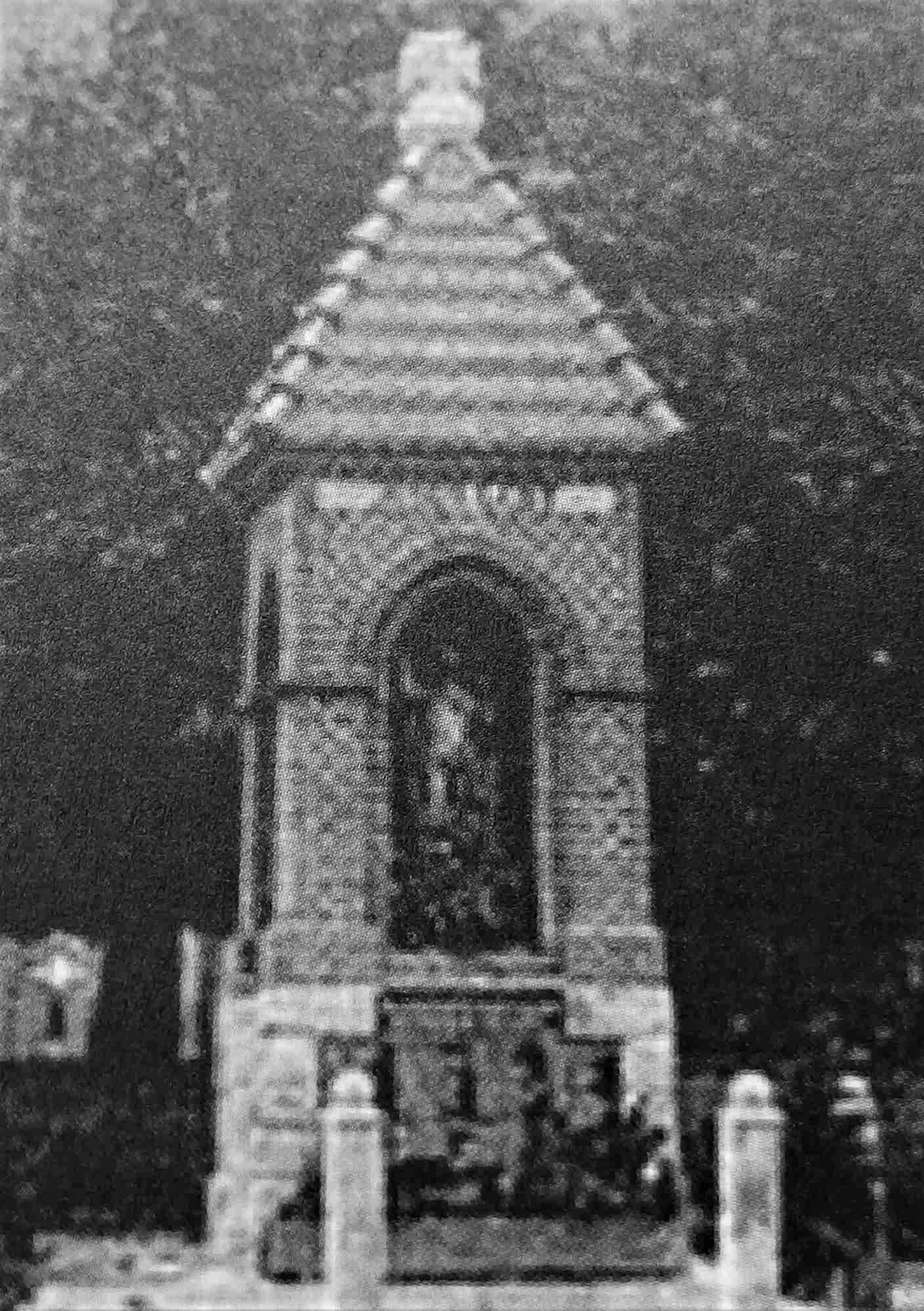 Vor der Kirche ein Denkmal für die Gefallenen des Ersten Weltkriegs in Form eines Tempels mit einer Christus-Figur darin, spitzem Dach und krönendem EK-Zeichen. Eine Widmungs- und Namenstafel war unten angebracht. Diese Tafel wurde entfernt und statt dem EK ein christliches Kreuz aufgesetzt.
