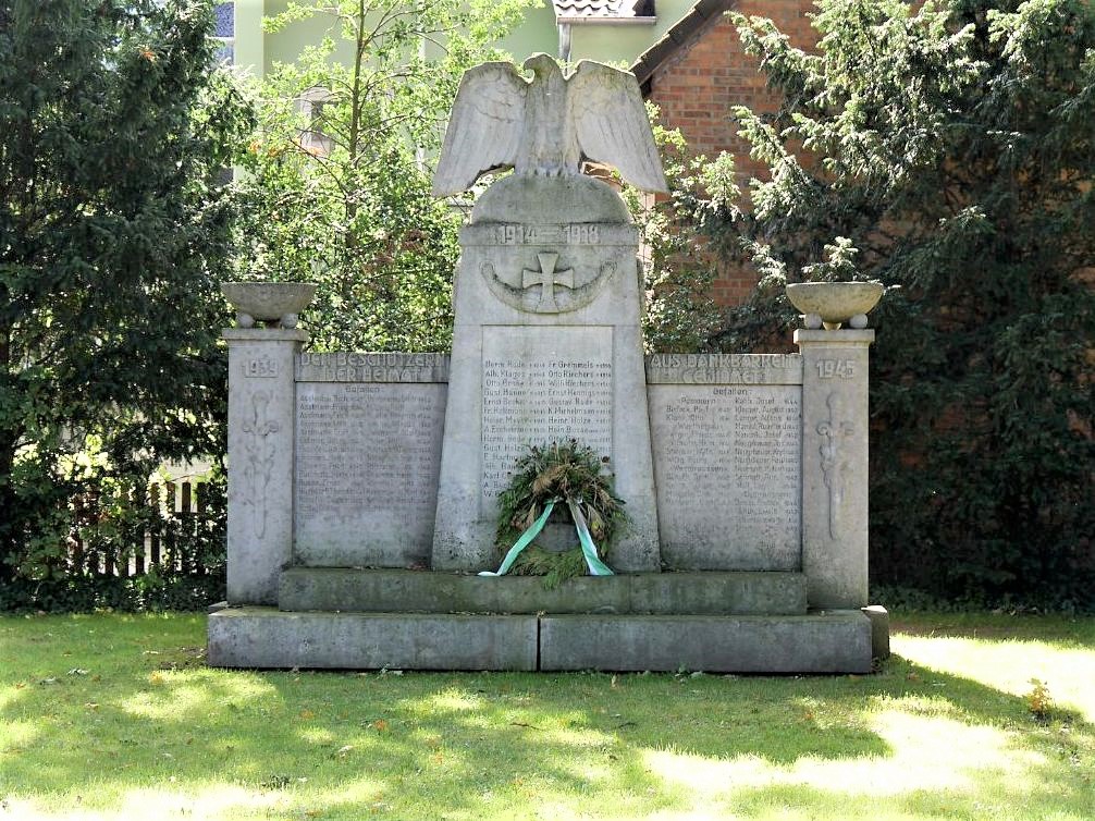 Das Denkmal wurde 1921 errichtet und vermutlich um 1960 um die beiden Seitenflügel erweitert. Die Erweiterung wurde von der Kommune ausgeführt, den Anstoß dazu gab laut Dorfgespräch Pastor Wilhelm Baumeister. Weil es mit dem Bau recht schnell gehen sollte, wurden noch nach der Fertigstellung weitere Namen bekannt, die dann aus Platzmangel auf den Fronttafeln seitlich und auf der Rückseite angebracht wurden.