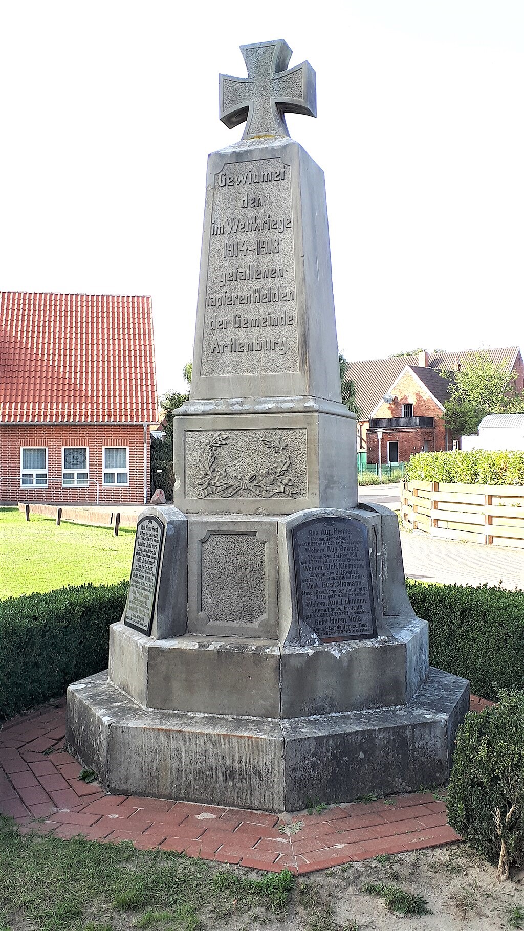 Steinstele auf einem 5-eckigen Podest vor der St. Nicolai-Kirche, auf den 5 Podestseiten Tafeln mit den Namen der Gefallenen des Ersten Weltkriegs.