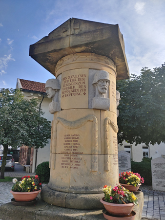 Rundsäule aus Sandstein mit quadratischer Abdeckung und vier herausragenden Soldatenköpfen für 1870 und den 1. Weltkrieg.