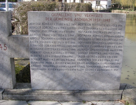 Standort ist die Ecke Seestraße – Hauptstraße. Links und rechts einer Figurengruppe stehen jeweils drei Steintafeln, die durch Steinkreuze in den Zwischenräumen miteinander verbunden sind. Auf den beiden äußersten Tafeln ist jeweils das Relief eines Engels, links eine Krone tragend und rechts die Posaune spielend. In die Kreuze sind Jahreszahlen eingeschlagen. Vier Tafeln tragen die Namen, Lebensdaten und Heimatorte der Gefallenen und Vermissten beider Weltkriege der Gemeinde Aschbach, den Schlüsselfelder Ortsteilen Ziegelsambach und Wüstenbuch sowie die der Heimatvertriebenen.