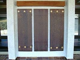 Friedhof Auerbach: An der Aussegnungshalle sind drei Holztafeln mit Namen von Gefallenen des Zweiten Weltkriegs angebracht.