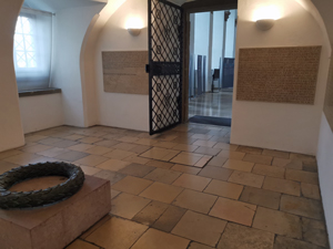 Im Augsburger Rathaus befindet sich im Erdgeschoss ein separater Raum mit einer Gedenkstätte für die in beiden Weltkriegen gefallenen Mitarbeitern der Stadt. Drei bronzene sowie sechs steinerne Tafeln führen die Namen auf. Ein bronzener Lorbeerkranz liegt auf einem Steinquader in der Mitte des Raumes.