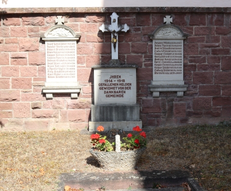 Links und rechts eines altarähnlich aufgebauten Mittelteils mit aufgesetztem Kreuz ist je eine Steintafel auf einem Sockel mit den Namen, der Einheit und dem Sterbedatum der Gefallenen des 1. Weltkrieges an der Wand befestigt und mit einer bogenförmigen Überdachung aus Stein versehen. In der linken Überdachung ist das Relief eines Schwertes mit einem Eichenzweig und in der Rechten ein Schwert mit Lorbeerzweig. Darauf aufgesetzt jeweils ein Tatzenkreuz.
