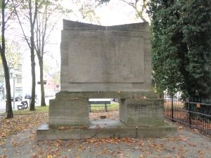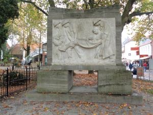 Schräg gegenüber ein Denkmal zum Gedenken an die Gefallenen des Ersten Weltkrieges (ohne Namen): Großer Block mit Relief, darauf drei Soldaten, die einen Kameraden davontragen.