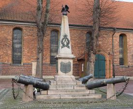 Denkmal vor der ev.-luth. Dreikönigskirche: Obelisk auf vier-stufigem Podest mit vier Wappenförmigen Metalltafeln, davon drei mit Namen, eine mit Inschrift, darüber jeweils Ornamente (Eichenlaub, Stahlhelm, Schwerter, Krone etc.). Auf der Spitze ein Adler mit ausgebreiteten Schwingen auf einer Kugel. Davor vier Kanonen erbeutet im Krieg von 1864 gegen Dänemark.