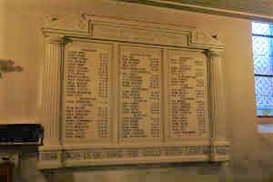 In der Kirche zwei tempelartige Steintafeln (Erster Weltkrieg) mit angedeuteten Säulen rechts und links. Die Gefallenen sind nach Kirchspielorten und mit dem Todesdatum aufgelistet.