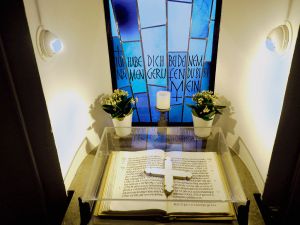 In der Turmhalle der Dreikönigskirche ein Gedenkbuch zu Ehren der Kriegsgefallenen des Zweiten Weltkriegs.