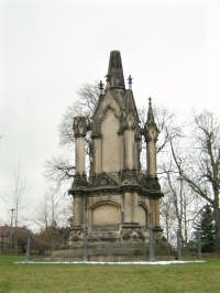 Das Denkmal ist aus Sandstein gebaut und hat die Form einer gotischen Kathedrale. Seine kleinen abstehenden Säulentürmchen laufen mit vielen Verzierungen nach oben hin spitz zu. Leider fehlt bei einem schon die Spitze. Auch die Spitze des Hauptteils ist abgeschlagen, was aber nicht die gotische Außenwirkung verlieren lässt. Auf jeder Seite finden sich zwei Namenstafeln. Auf dem Sockel sind je kleinere Tafeln, die mit dreieckigen Schmuckgiebeln überdacht sind. Darin stehen die Namen der gefallenen Offiziere, sowie die Inschrift auf einer Seite.