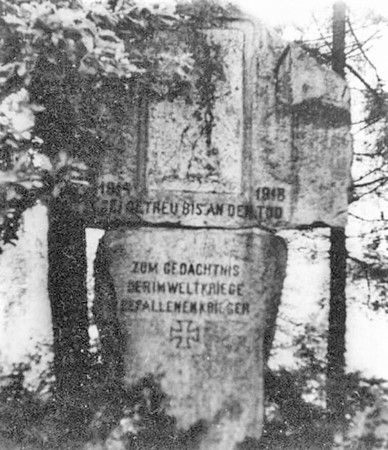Aus dem unteren Stein wurde ein neuer Gedenkstein für alle Kriegsopfer gemacht, mit einem EK-Zeichen, den Zahlen „1914-1918“ und einer Widmungsplakette.