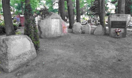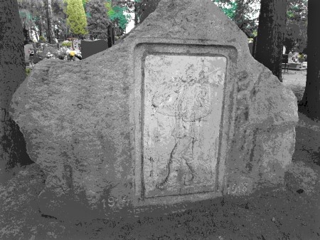 Teile des ehemaligen Denkmals für die Gefallenen des Ersten Weltkriegs. Das Denkmal wurde aus zwei Teilen errichtet. Ein kleinerer senkrechter Felsblock trug einen großen oben quer liegenden Block und bildete die Form eines germanischen Thors-Hammer. Auf dem großen Findling befindet sich das Relief eines marschierenden Soldaten mit geschultertem Gewehr und Widmung unten (Kopf des Soldaten herausgeschlagen). Das Denkmal stand noch viele Jahre nach 1945 auf dem Friedhof ehe es umgestürzt wurde. Um die Teile wurde ein Lapidarium errichtet.