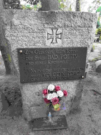 Nach 1945 wurde in Hinterpommern die deutsche Bevölkerung vertrieben und die meisten Denkmäler abgerissen, beschädigt oder umgewidmet. Dieses Denkmal wurde lange nach 1945 umgestürzt und später in einem Lapidarium aufgestellt. In einem alten Zeitungsartikel ist vermerkt, dass sich um das Denkmal im Halbkreis Soldatengräber befanden. Einer der nicht mehr lesbaren Steine im Lapidarium könnte ein Grabstein davon sein. Ansonsten fehlt von den Soldatengräbern jede Spur.