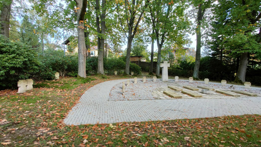 Kriegsgräberstätte auf dem evangelisch-lutherischen Friedhof. Weiße Steinkreuze kennzeichnen die Gräber der Toten aus beiden Weltkriegen.