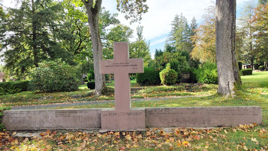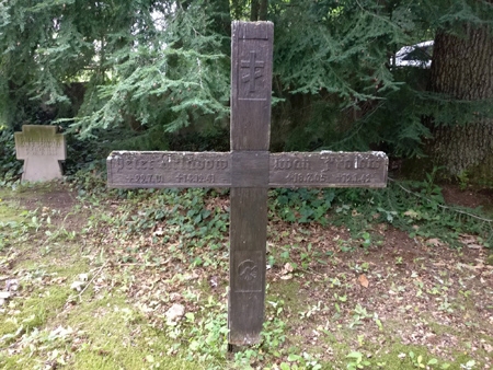 Ein Holzkreuz kennzeichnet das Grab von zwei russischen Zwangsarbeitern. Links davon, am Hauptweg,