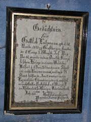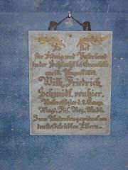 Tafel Schmidt: Es fiel Für König und Vaterland in der Schlacht bei ................. am 18. August 1870 Wilhelm Friedrich Schmidt, von hier. Unteroffizier d. 2. Comp. Magd. Füs. Reg. No. 36. Zum Andenken gewidmet von den tiefbetrübten Eltern.