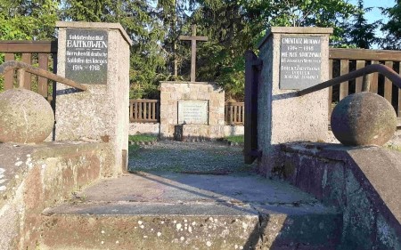 Kriegsgräberstätte für Gefallene des Ersten Weltkriegs an der Dorfstraße: Kleine Anlage mit Treppenaufgang, Pfeilern und ein Denkmal mit Widmung und Kreuz umschlossen von einem Holzzaun