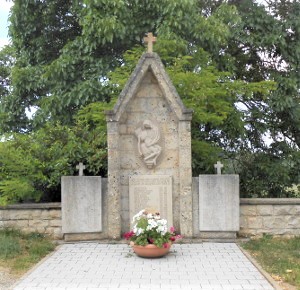 Friedhof: Überdachtes Denkmal mit einem Steinkreuz, Fläche leicht nach hinten versetzt, unten eine Steinplatte mit einer Inschrift und den Namen des Ersten Weltkriegs,