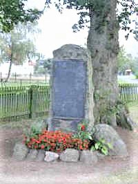 Daneben ein Findling als Ehrenmal für die Kriegstoten beider Weltkriege mit eingelassener Metallplatte und Inschrift.