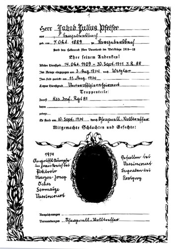 | Gefreiter | PFEIFER | Fritz | 25.11.1887 | Res.Inf.Rgt. 81, 11.Komp., Ers.Btl. Inf.Rgt. 81, Inf.Rgt. 365/III. 11.Komp | eingezogen 05.08.1914, ins Feld 05.08.1914, Heimkehr 28.11.1918 |