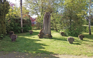 Um eine Steinskulptur gegenüber der Aussegnungshalle sind Steinkreuze ohne Namen mit den Jahreszahlen der beiden Weltkriege angeordnet.