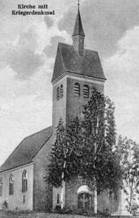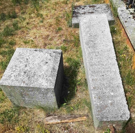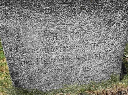 Ehemaliges Denkmal für die Gefallenen des Ersten Weltkriegs: Quader mit Widmung und aufgesetztem Obelisken mit den Namen der Gefallenen. Das Denkmal wurde nach 1945 umgestürzt und die Teile liegen heute am Rande des Kirchhofs.