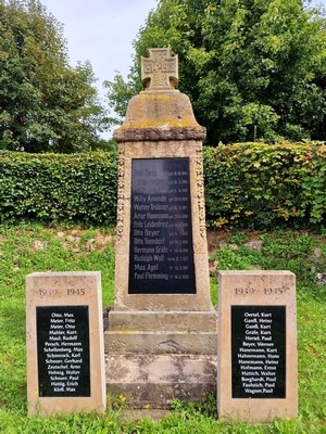 Für die Opfer des Zweiten Weltkrieges wurden 2012 bei einer Gesamtrestaurierung der Anlage links und rechts vor das Denkmal quaderförmige Steine aus dem gleichen Material gesetzt, die neben den Jahreszahlen des Krieges die Namen der Opfer auf ebenfalls schwarzen Tafeln tragen.