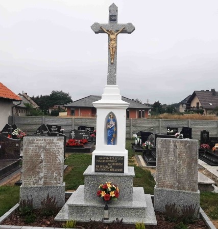 Denkmal für die Gefallenen des Zweiten Weltkriegs auf dem örtlichen Friedhof: Abgestufte Stele mit aufgesetztem Kreuz und zwei beigestellten Namenssteinen.