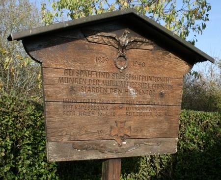 Holztafel mit den Namen von Gefallenen der Aufkl. Abt. 179. Die Tafel steht auf dem Friedhof der Kirche St. Heinrich.