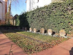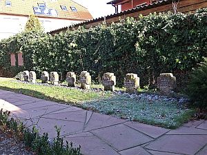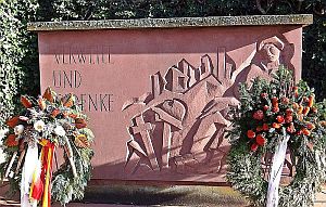 Freistehende Sandstein-Gedenkplatte. An der Mauer dahinter sind sechs Gedenkplatten angebracht. Links und rechts davon stehen Steinkreuze der Kriegsgräberstätte